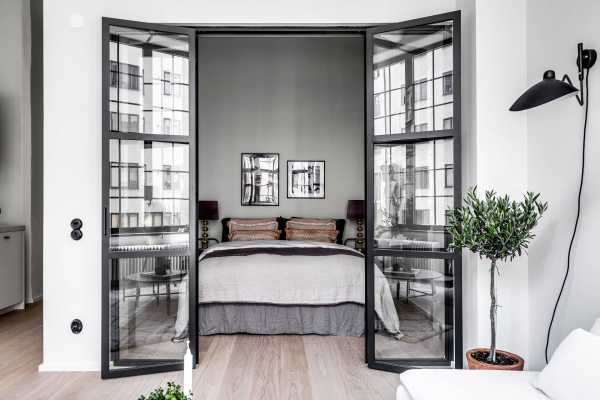 Еще один эффективный способ зонирования пространства. Раздвижная система занимает немного места, практически как штора, но значительно эффективнее разделяет помещение.