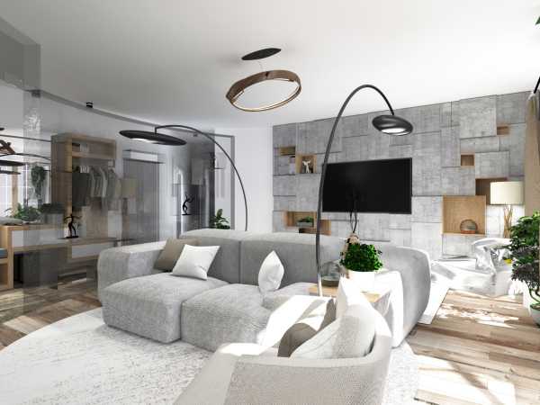 Современный дизайн гостиной с перегородкой