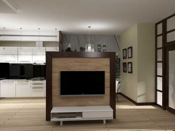 В разделительной конструкции можно обустроить нишу для установки телевизора. В данном случае помещение получится фактически полностью разделено на две комнаты, но без дверных проемов.