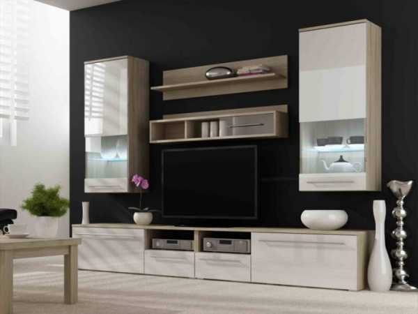 Еще с советских времен известно размещение телевизора в нише корпусной стенки. Но там, как правило, было немного места. Современные же модульные варианты могут похвастаться возможностью размещения в них любого по размеру телевизора. Существует два варианта модульных стенок, которые различаются по конфигурации. Это: