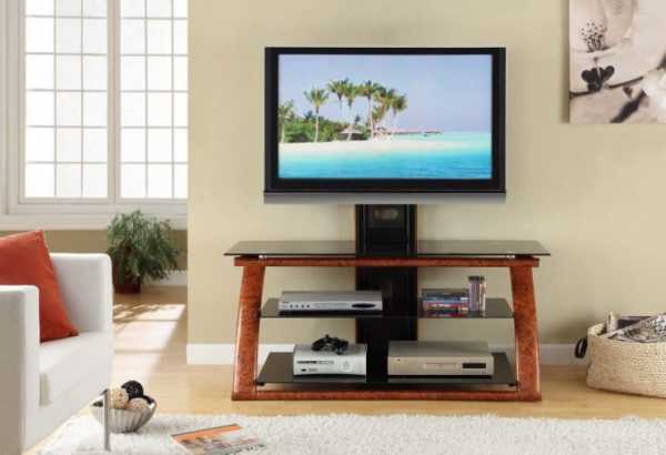 Сейчас представлено много видов стоек под ТВ. Среди них особенно выделяются навесные модели с поворотными механизмами, которые представляют собой панель, расположение которой можно сменить при перемещении; напольные на колесиках; настольные, прекрасно вписывающиеся в небольшие помещения; с наличием кронштейна.