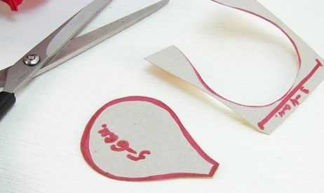 - Сложите гармошкой полосу красной гофрированной бумаги, приложите шаблон лепестка из картона и вырежьте. Для одной розы должно быть 15 лепестков.