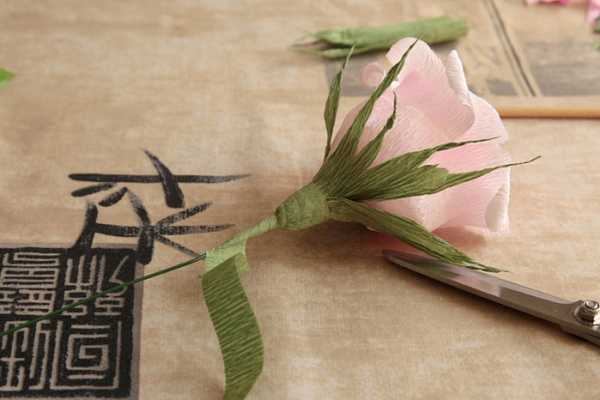С помощью термопистолета или хорошего ПВА приклеиваем чашелистик к нашей розе.