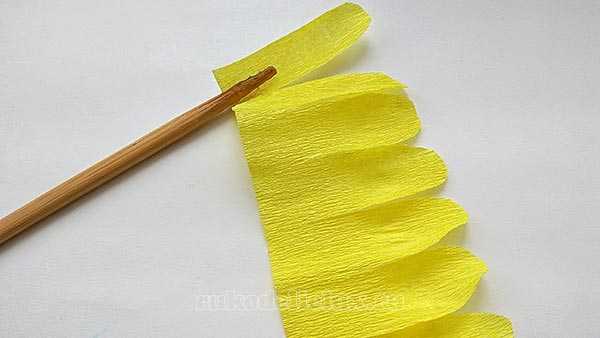 Если хочется добавить пышности, несколько новых лепестков, то повторите процедуру с желтой гофрированной бумагой, сделайте еще одну такую же полосу по указанной выше методике, затем превратите ее в бахрому с округлыми отростками-лепестками и приклейте вторым слоем.
