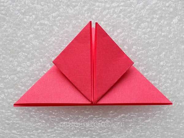Снова развернем заготовку цветка другой стороной, ранее отогнутый треугольник нужно расположить строго вертикально. Это будет сердцевина нашего цветка.