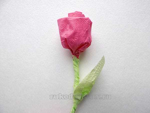 Использовать можно салфетки разных цветов, но важно, чтобы они имели одинаковый размер. Мы будем делать цветок розового цвета, поэтому приготовили бумажную салфетку соответствующего оттенка. А для создания стебля и листочка пригодится зеленая салфетка. Сначала полностью развернем бумажную салфетку зеленого цвета.