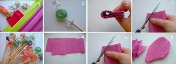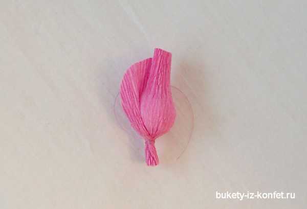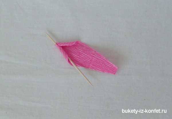 - Возьмите шпажку с конфетой и скотчем приклейте лепесток у основания.
