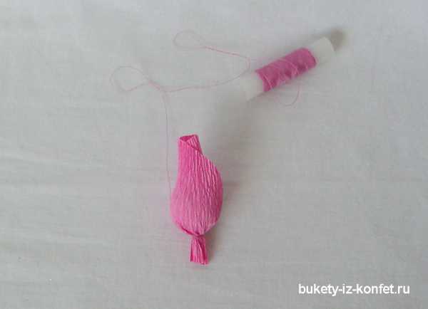 Затем берем первый основной лепесток, немного вытягиваем серединку и заворачиваем конфетку, как показано на фото, фиксируем нитками.
