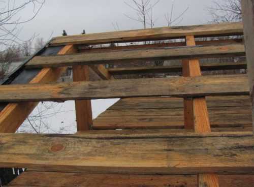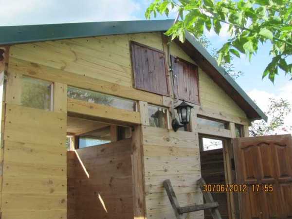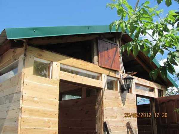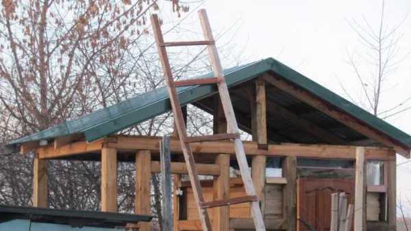После завершения строительства каркаса можно приступать к выполнению перекрытия. Установка двускатной крыши затруднит накапливание на ней снега, обеспечит хороший сток воды. Основой кровли будут деревянные бруски, установленные с интервалом в полметра. Каркас поверхности должен выходить за периметр постройки на 30 сантиметров. Используйте в качестве покрытия металлическую черепицу или шифер. Для сооружения потолка подойдут струганые доски, имеющие толщину 20 мм.