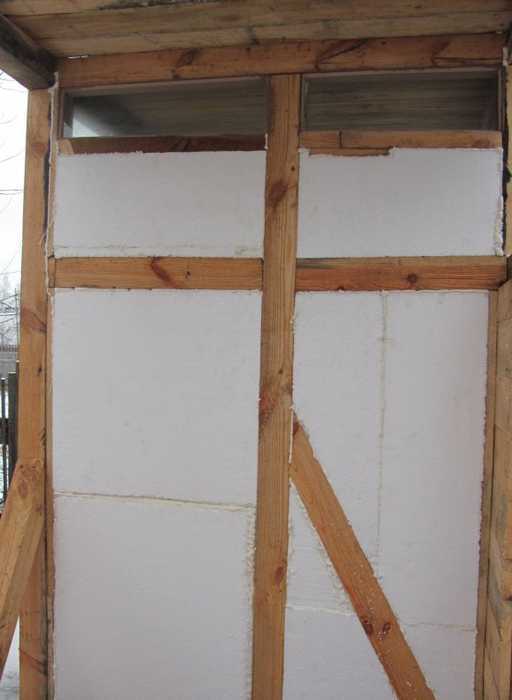 После того, как мы утеплили строение пенопластом, со стороны улицы прикрутим по периметру тёс толщиной 20 мм. Фронтон утеплять не стали, закрыли это пространство декоративной вагонкой.