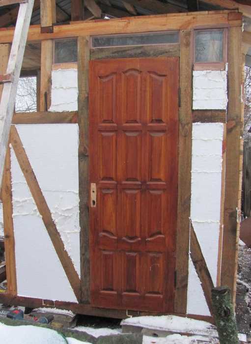 Комфортный температурный режим помещения обеспечат листы пенопласта, расположенные между тесом и каркасом. На заключительной стадии навесьте на петли двери, которые могут запираться на ключ. Остается подключить коммуникации к емкости с водой и покрасить готовую конструкцию.