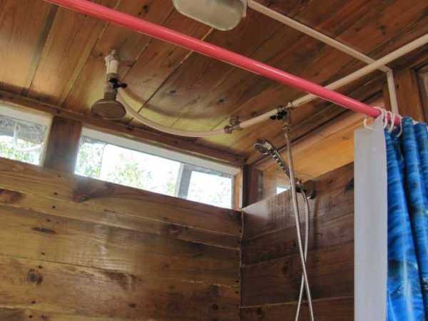 Главная функциональная особенность уличного душа (кстати, тут можно посмотреть подробный процесс строительства дачного душа приведенного на фото ниже) — нагрев воды происходит благодаря бесплатной солнечной энергии. В соответствии с этим оптимальное место для постройки должно максимально долго освещаться на протяжении дня. Учитывая необходимость защиты от ветра и заботу о целостности ландшафтного дизайна, под кабинку можно отвести уголок сада или место возле забора.