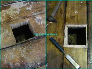 Дальше с помощью молотка и стаместки выбрали пазы из доски, чтобы трап встал заподлицо с полом.