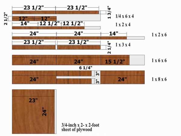Ниже на фото показана распиловка деталей, размеры в дюймах. Перевести в сантиметры очень просто, умножьте показатели на 2,54 и все. Например, 23-1/2 дюйма, это умножить на 2,54 будет 59,95 см, в общем 60 см.
