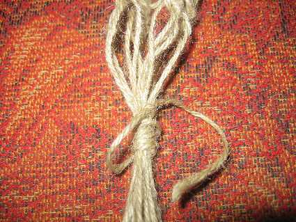 Все нити стягиваем в пучок. Берем отрезок нити, складываем пополам и прибавляем ко всем нитям петлей вверх.