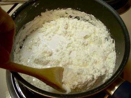 6. Когда сковорода станет теплой, но не горячей, появятся первые пузырьки, тогда высыпаем половину стакана крахмала и интенсивно перемешиваем, затем вторую часть и мешаем, не останавливаясь.