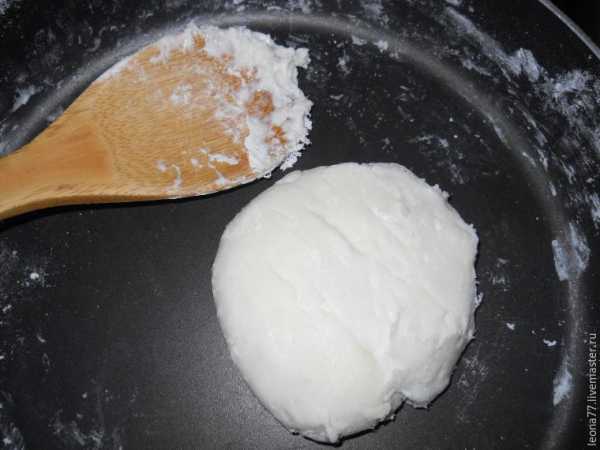 Вы в это время вымойте сковороду и все, что было с клеем. Клей быстро отмывается простым моющем средством и горячей водой. После этого протрите руки влажной салфеткой и сухим вафельным полотенцем (иначе все останется в фарфоре), припудрите руки в крахмале и начинайте интенсивно вымешивать массу. Масса должна быть теплой, не горячей, иначе будет клейстер. Я на доске не вымешиваю, а делаю это в руках — разминаю, как пластилин, растягиваю, сминаю и так далее. Если прилипает к рукам, чуть припудрите массу и продолжайте в течении 5 минут. Масса должна получиться пластичной (не рваться), мягкой, бархатистой, белоснежной.