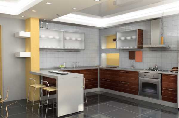 Вариант с разноуровневыми потолочными конструкциями подходит лишь в том случае, если расстояние от потолка до пола не менее 3 м. А на подиуме обычно размещают рабочую зону кухни.